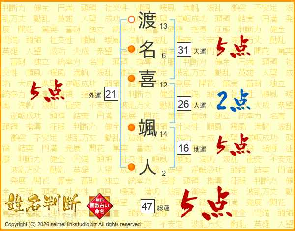 渡(13画)名(6画)喜(12画) 颯(14画)人(2画)