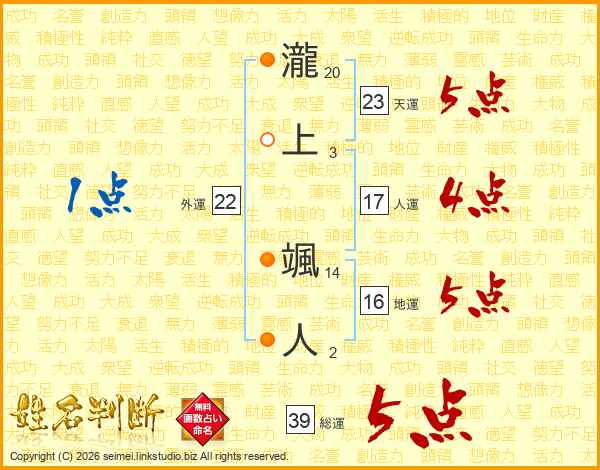 瀧上颯人さんの天運は23画の5点!