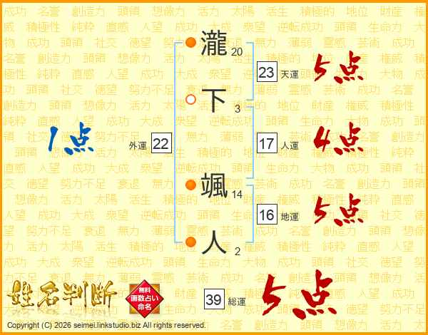 瀧(20画)下(3画) 颯(14画)人(2画)