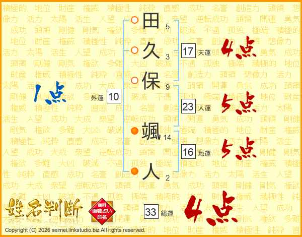 田(5画)久(3画)保(9画) 颯(14画)人(2画)