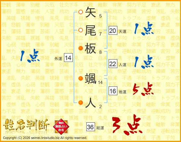 生活面を象徴する運勢です。外部から受ける影響力を表し、結婚運、家庭運や職場、環境への順応性を表します。総運から人運を引いた画数。姓や名が1文字の場合を除く。