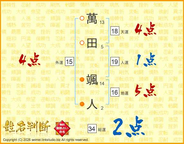 萬(13画)田(5画) 颯(14画)人(2画)