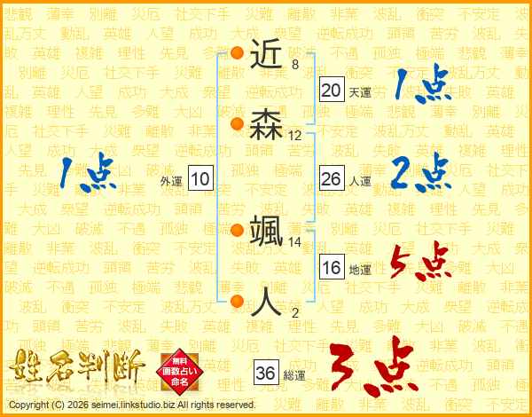 生活面を象徴する運勢です。外部から受ける影響力を表し、結婚運、家庭運や職場、環境への順応性を表します。総運から人運を引いた画数。姓や名が1文字の場合を除く。