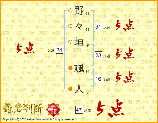 野(11画)々(11画)垣(9画) 颯(14画)人(2画)