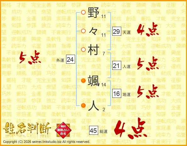 野(11画)々(11画)村(7画) 颯(14画)人(2画)