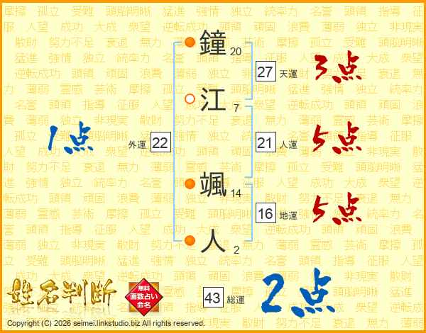 鐘江颯人さんの人運は21画の5点!