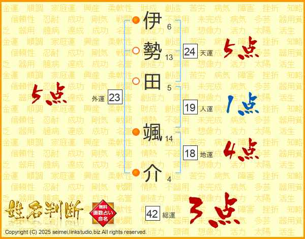 伊(6画)勢(13画)田(5画) 颯(14画)介(4画)