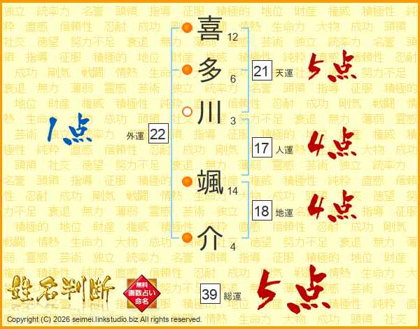 喜多川颯介さんの総運は39画の5点!