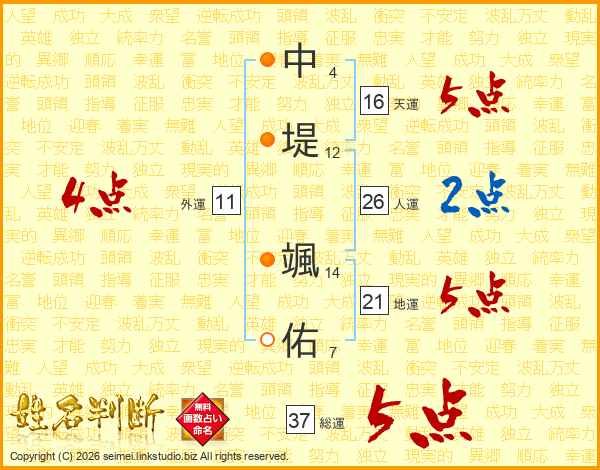 中(4画)堤(12画) 颯(14画)佑(7画)