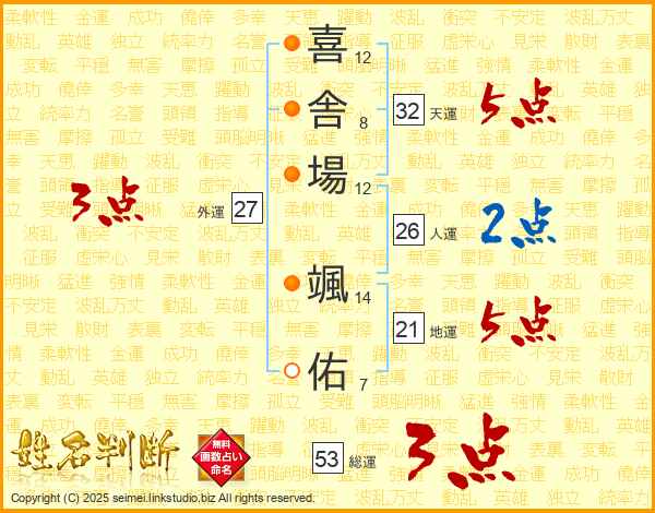 喜(12画)舎(8画)場(12画) 颯(14画)佑(7画)