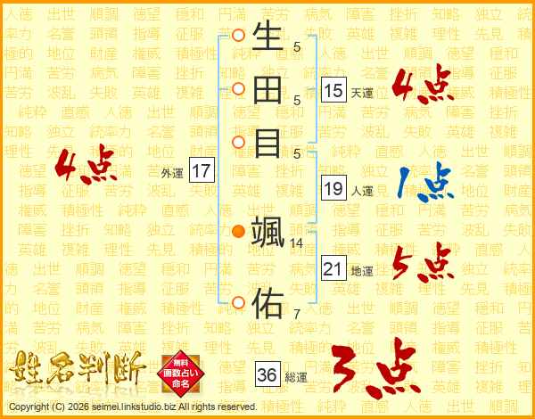 生(5画)田(5画)目(5画) 颯(14画)佑(7画)