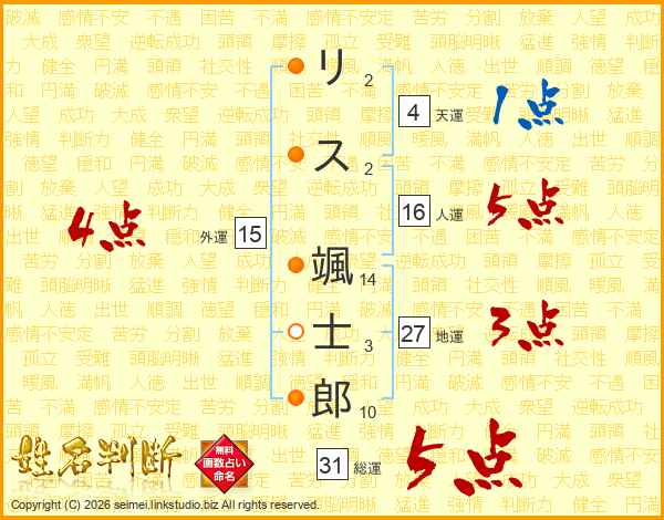 リス颯士郎さんの総運は31画の5点!
