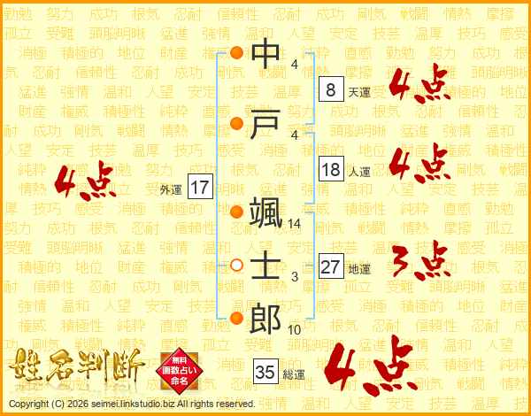 中(4画)戸(4画) 颯(14画)士(3画)郎(10画)