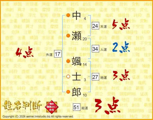 中瀬颯士郎さんの天運は24画の5点!