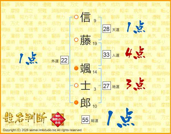 信(9画)藤(19画) 颯(14画)士(3画)郎(10画)