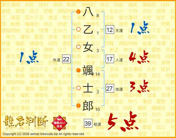 八(8画)乙(1画)女(3画) 颯(14画)士(3画)郎(10画)