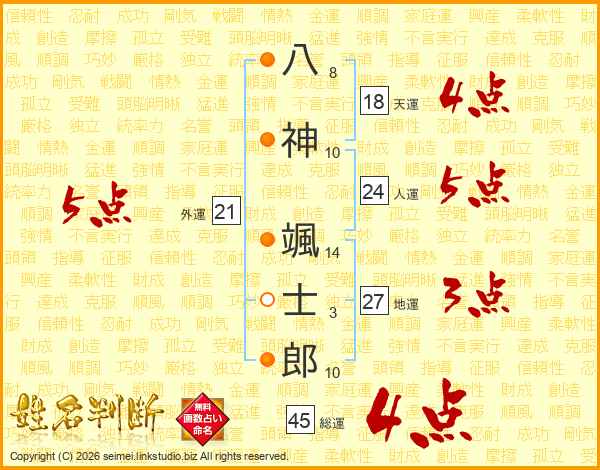 八(8画)神(10画) 颯(14画)士(3画)郎(10画)