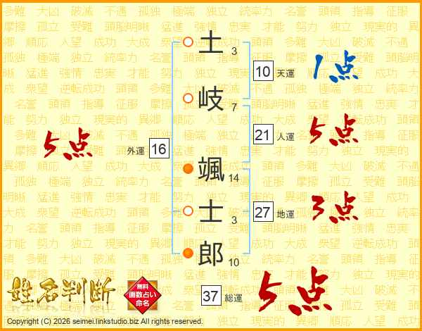 土(3画)岐(7画) 颯(14画)士(3画)郎(10画)