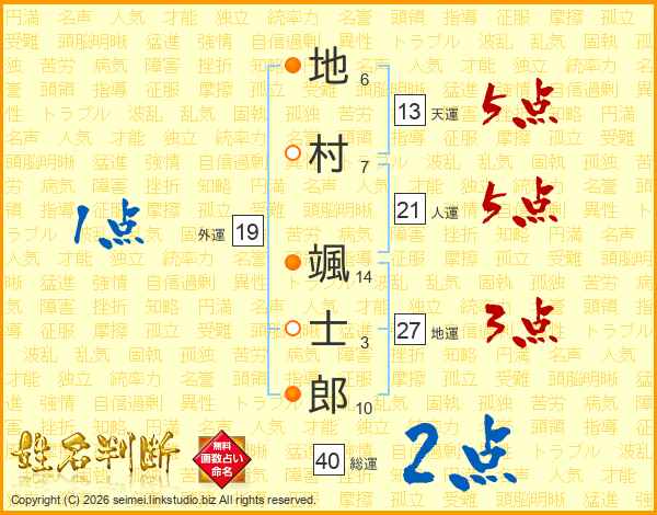 地(6画)村(7画) 颯(14画)士(3画)郎(10画)