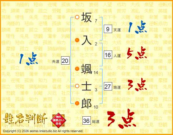 坂(7画)入(2画) 颯(14画)士(3画)郎(10画)