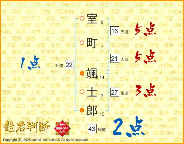 室(9画)町(7画) 颯(14画)士(3画)郎(10画)