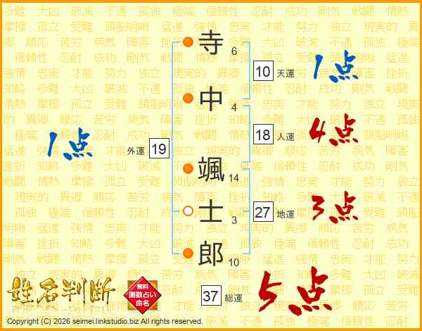寺(6画)中(4画) 颯(14画)士(3画)郎(10画)