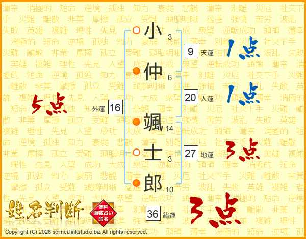小(3画)仲(6画) 颯(14画)士(3画)郎(10画)