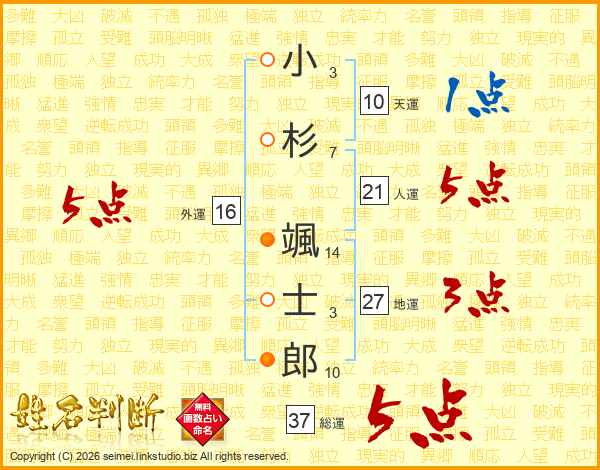 小(3画)杉(7画) 颯(14画)士(3画)郎(10画)