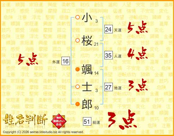 小(3画)桜(21画) 颯(14画)士(3画)郎(10画)