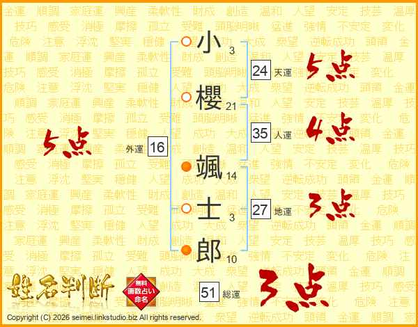 小(3画)櫻(21画) 颯(14画)士(3画)郎(10画)