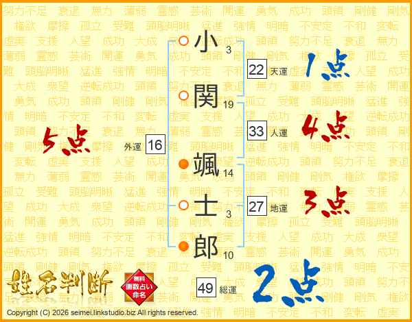 小(3画)関(19画) 颯(14画)士(3画)郎(10画)