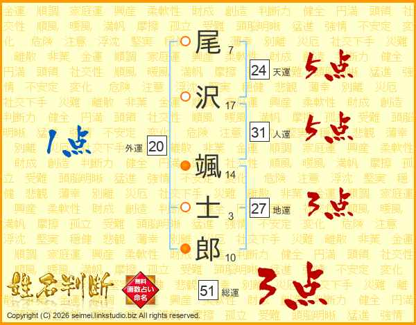 尾(7画)沢(17画) 颯(14画)士(3画)郎(10画)
