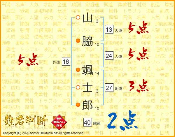 山(3画)脇(10画) 颯(14画)士(3画)郎(10画)