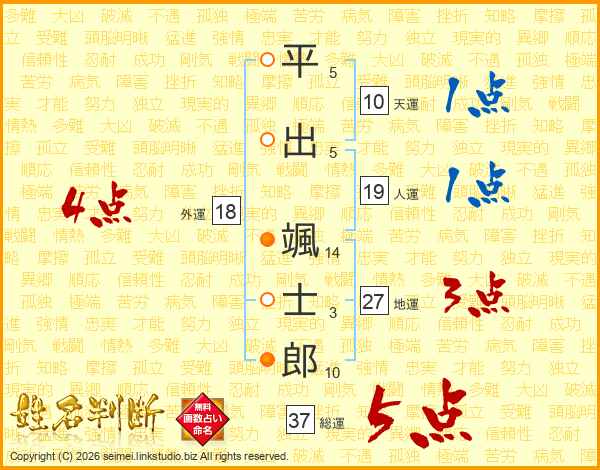 平(5画)出(5画) 颯(14画)士(3画)郎(10画)