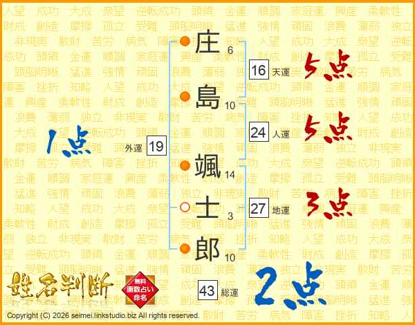 庄(6画)島(10画) 颯(14画)士(3画)郎(10画)