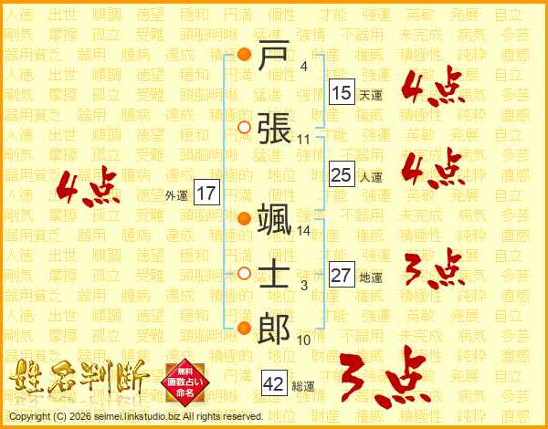 戸(4画)張(11画) 颯(14画)士(3画)郎(10画)