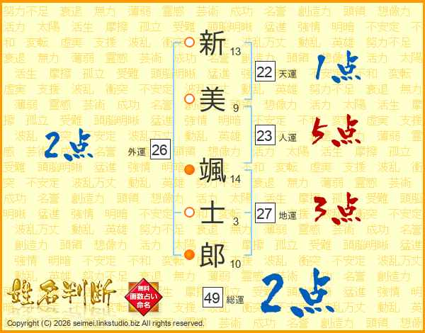 新(13画)美(9画) 颯(14画)士(3画)郎(10画)