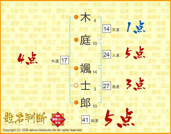 木(4画)庭(10画) 颯(14画)士(3画)郎(10画)