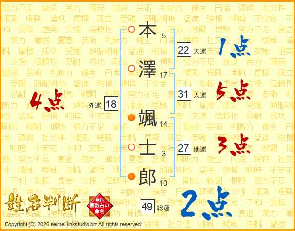 本澤颯士郎さんの人運は31画の5点!