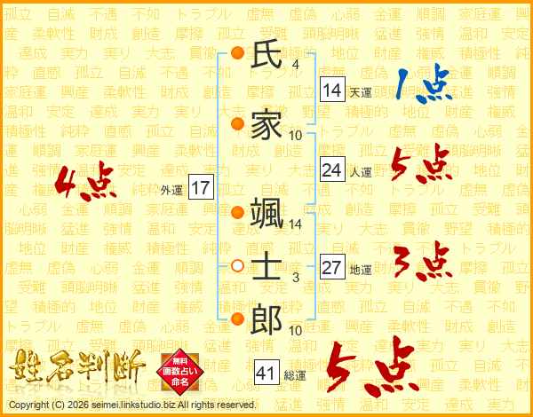 氏(4画)家(10画) 颯(14画)士(3画)郎(10画)