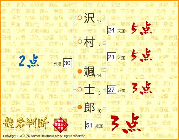 沢(17画)村(7画) 颯(14画)士(3画)郎(10画)