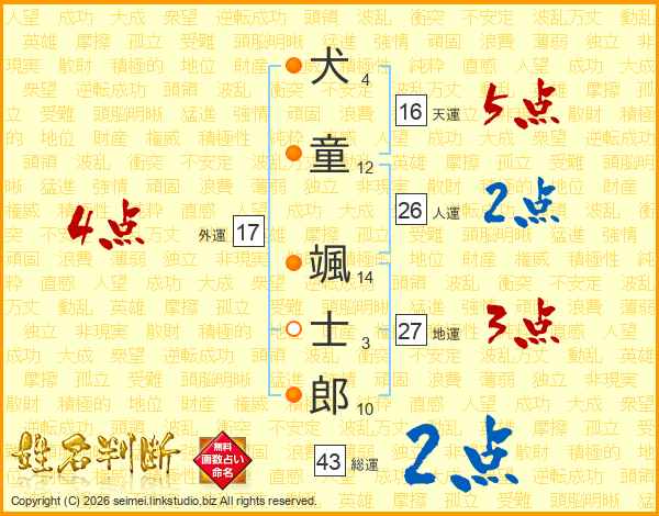 犬(4画)童(12画) 颯(14画)士(3画)郎(10画)