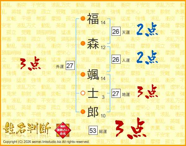 福(14画)森(12画) 颯(14画)士(3画)郎(10画)