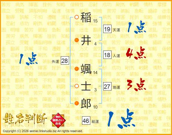 稲(15画)井(4画) 颯(14画)士(3画)郎(10画)
