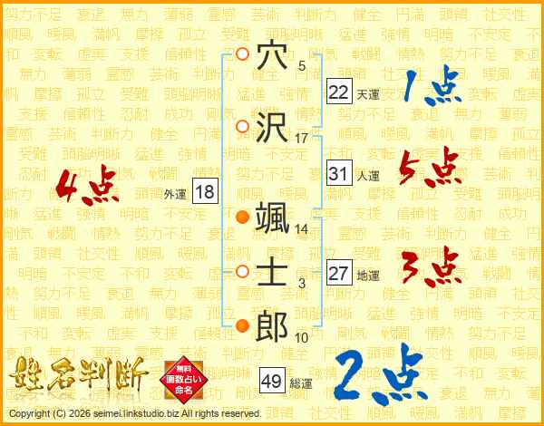 穴(5画)沢(17画) 颯(14画)士(3画)郎(10画)