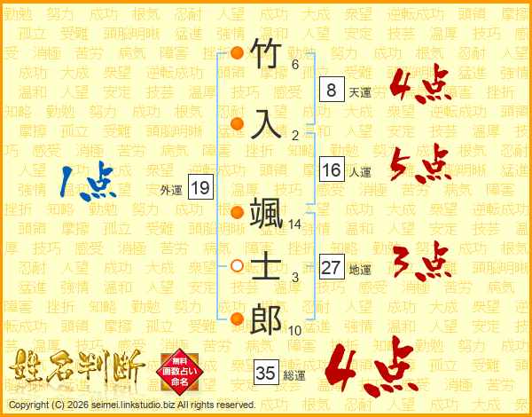 竹(6画)入(2画) 颯(14画)士(3画)郎(10画)