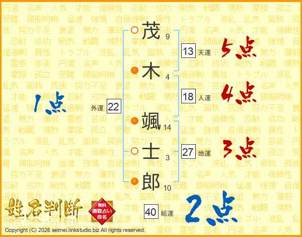 茂(9画)木(4画) 颯(14画)士(3画)郎(10画)
