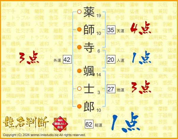 薬(19画)師(10画)寺(6画) 颯(14画)士(3画)郎(10画)
