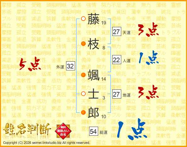 藤(19画)枝(8画) 颯(14画)士(3画)郎(10画)