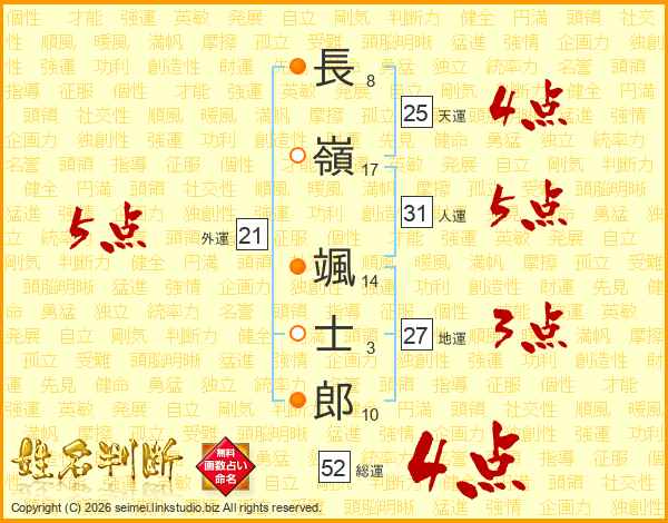 長(8画)嶺(17画) 颯(14画)士(3画)郎(10画)